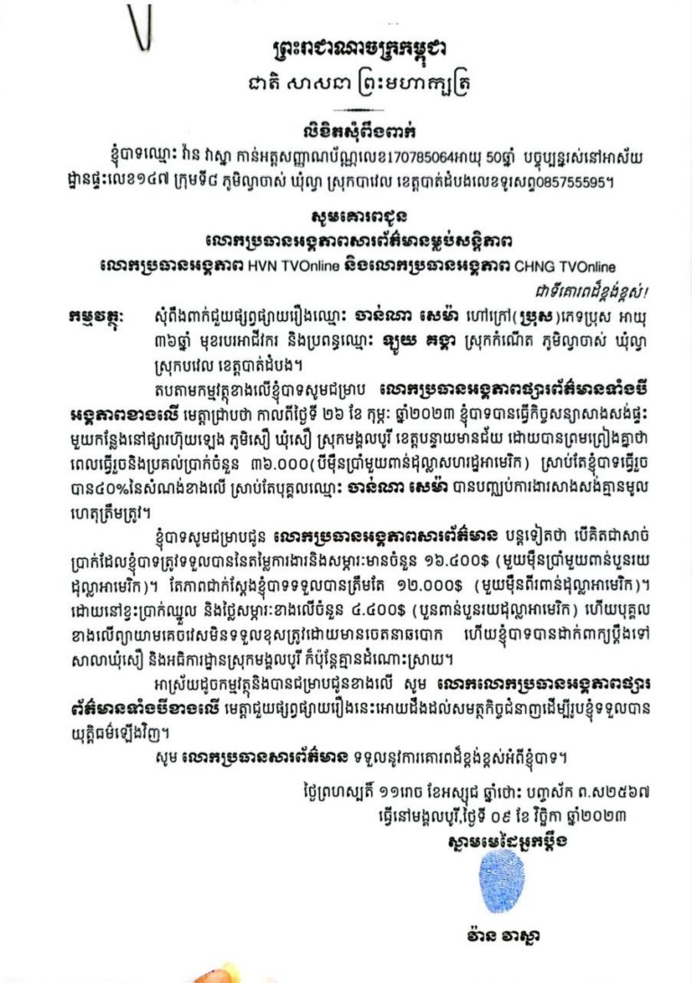 ខ្ញុំបាទសូមជម្រាបជូនលោកប្រធានអង្គភាពសារព័ត៌មាន បន្តទៀតថា បើគិតជាសាច់ប្រាក់ដែលខ្ញុំបាទត្រូវទទួលបាននៃតម្លៃការងារថ្មើរ និងចំនូន១៦៤០០$ (មួយមុឺនប្រាំមួយពាន់បួនរយដុល្លា)គិតទាំងសម្ភារៈនិងកម្លាំងពលកម្ម។តែភាពជាក់ស្ដែងខ្ញុំបាទទទួលបានត្រឹមតែ១២០០០$(មួយមុឺនពីពាន់ដុល្លា)។ដោយនៅខ្វះប្រាក់ឈ្នួលខាងលើចំនួន៤៤០០$(បួនពាន់បួនរយដុល្លា)ហើយបុគ្គលខាងលើព្យាយាមគេចវេសមិនទទួលខុសត្រូវដោយមានចេតនាឈរបោក ហើយខ្ញុំបាទបានដាក់ពាក្យប្ដឹង ទៅសាលាឃុំ និងអធិការដ្ឋាន ស្រុកមង្គលបុរី ក៏ប៉ុន្តែគ្មានដំណោះស្រាយ។