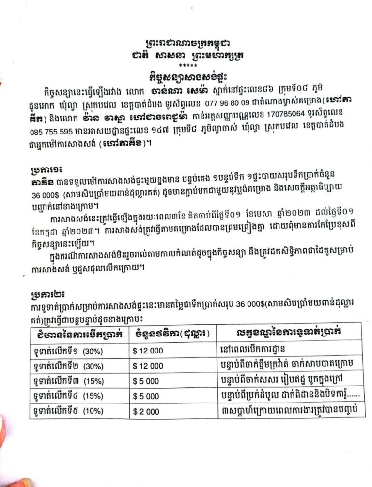 ខ្ញុំបាទ សូមជម្រាបលោកប្រធានអង្គភាពផ្សារព័ត៌មានទាំងបីអង្គភាពខាងលើមេត្តាជ្រាបថាកាលពីថ្ងៃទី26 ខែ2 ឆ្នាំ 2023 ខ្ញុំបាទ បានធ្វើកិច្ចសន្យាសាងសង់ផ្ទះមួយកន្លែងនៅផ្សារហ៊ុយឡេង ភូមិសឿ ឃុំសឿ ស្រុកមង្គលបុរី ខេត្តបន្ទាយមានជ័យ ដោយបានព្រមព្រៀងគ្នាថាពេលធ្វើរួចនិងប្រគល់លុយចំនួន៣៦០០០(សាមសិបប្រាំមួយពាន់ដុល្លាសហរដ្ឋអាមេរិក)ស្រាប់តែខ្ញុំបាទធ្វើរួចបាន ៤០% នៃសំណង់ខាងលើ ស្រាប់តែបុគ្គលឈ្មោះ ចាន់ណាសេម៉ា បានបញ្ឈប់ការងារសាងសង់គ្មានមូលហេតុត្រឹមត្រូវ។