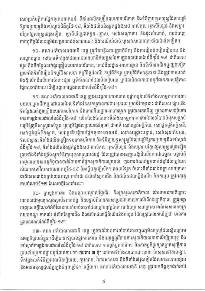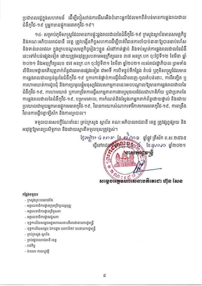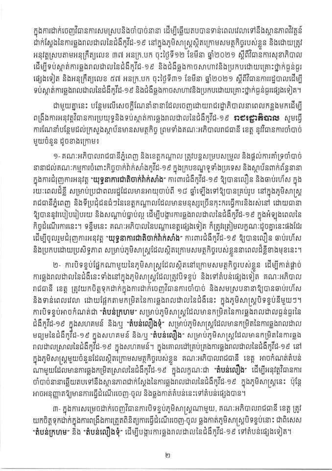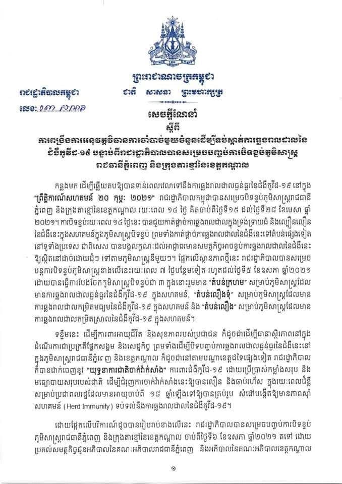រាជរដ្ឋាភិបាលចេញសេចក្តីណែនាំ(០៣ សណន) ចុះថ្ងៃទី០៤ ខែឧសភា ឆ្នាំ២០២១ ស្ដីពីការពង្រឹងការអនុវត្តវិធានការចាំបាច់មួយចំនួន ទប់ស្កាត់ការឆ្លងរាលដាលនៃជំងឺកូវីដ១៩ បន្ទាប់ពីរាជរដ្ឋាភិបាល ចេញសេចក្ដីសម្រេចស្ដីពី ការបញ្ចប់ការបិទខ្ទប់ភូមិសាស្ត្ររាជធានីភ្នំពេញ និងក្រុងតាខ្មៅ នៃខេត្តកណ្តាល។
