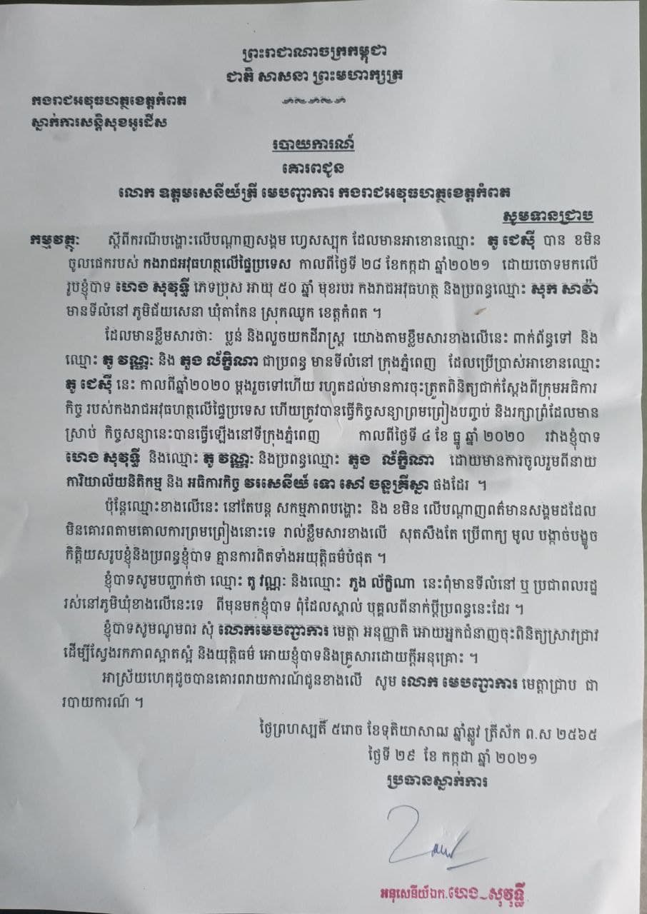 (ខេត្តកំពត) ៖ លោកអនុសេនីយ៍ឯក ហេង សុវុទ្ធី មេបញ្ជាការរងកងរាជវុធហត្ថស្រុកឈូក និងប្រពន្ធឈ្មោះ សុខ សាវ៉ាត នៅរសៀលថ្ងៃទី៧ ខែកញ្ញា ឆ្នាំ២០២១ នេះ បានចេញមកបំភ្លឺនិងច្រានចោលរាល់ការប្រកាន់តាមបណ្តាញសង្គម FB ដែលមានអាខោនឈ្មោះ ភូជេស៊ី ទៅខមិនចូលផេកPMផ្ទៃប្រទេស (GRknews) និងអាខោនឈ្មោះស្អែកស្លាប់ស្អែកស្លាប់ ត្រូវបំរើរាស្ត្របានសរសេរបង្ហោះថា លោកប្លង់និងលួចដីរស្ត្រ ហើយថ្មីៗនេះបុរសម្នាក់រស់នៅប្រទេថៃឈ្មោះប៉ាលាំង ដោយប្រើប្រាស់អាខោនfbឈ្មោះ jasadadajacksrun បានធ្វើការឡាយដោយទាញយកការបង្ហោះរបស់fbខាងលើនោះមកវាយប្រហារលោកទាំងមិនរឿងពិតផងនោះ។