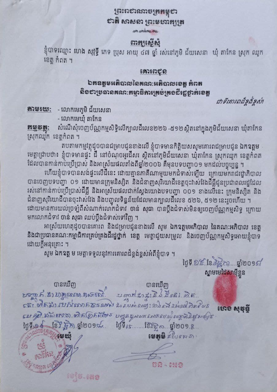 លោកបានបញ្ជាក់ថាដីចំការចំនួន១២ហិកតា ស្ថិតនៅភូមិជ័យសេនាឃុំតាកេន ស្រុកឈូក ខេត្តកំពត ដែលមានទំនាស់នោះ លោកកាន់កាប់និងអាស្រ័យផលតាំងពីឆ្នាំ២០០៥ ដល់ឆ្នាំ២០០៧ លោកបានសង់លំនៅដ្ឋានលើដីហ្នឹងនោះទៀត ហើយក៏គ្មានអ្នកណាមកជំទាស់ដែររហូតដល់ឆ្នាំ២០១២ ក្រុមនិស្សិតសម្តេចតេជោបទបញ្ជា០១ចុះមកវាស់វែងដើម្បីចេញប្លង់កម្មសិទ្ធិ ។ តែត្រូវបានលោកជំទាវឈ្មោះ ចាន់ សុធា ចេញមុខមកជំទាស់ក្បាល់ដីលេខ២២៦.២១២ ទើបមានការខកខានចេញប្លង់ ។ ក្រោយពីមានការស្រាវជ្រាវពីអាជ្ញាធរទើបលោកជំទាវចាន់សុធាដកពាក្យបណ្តឹងវិញព្រោះជាការភាន់ច្រឡំ ។