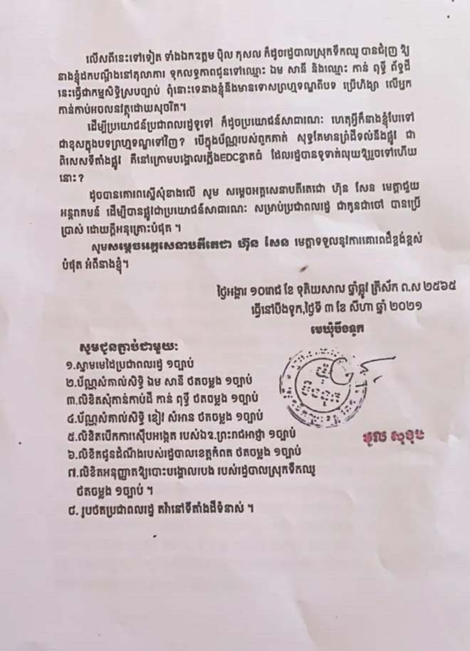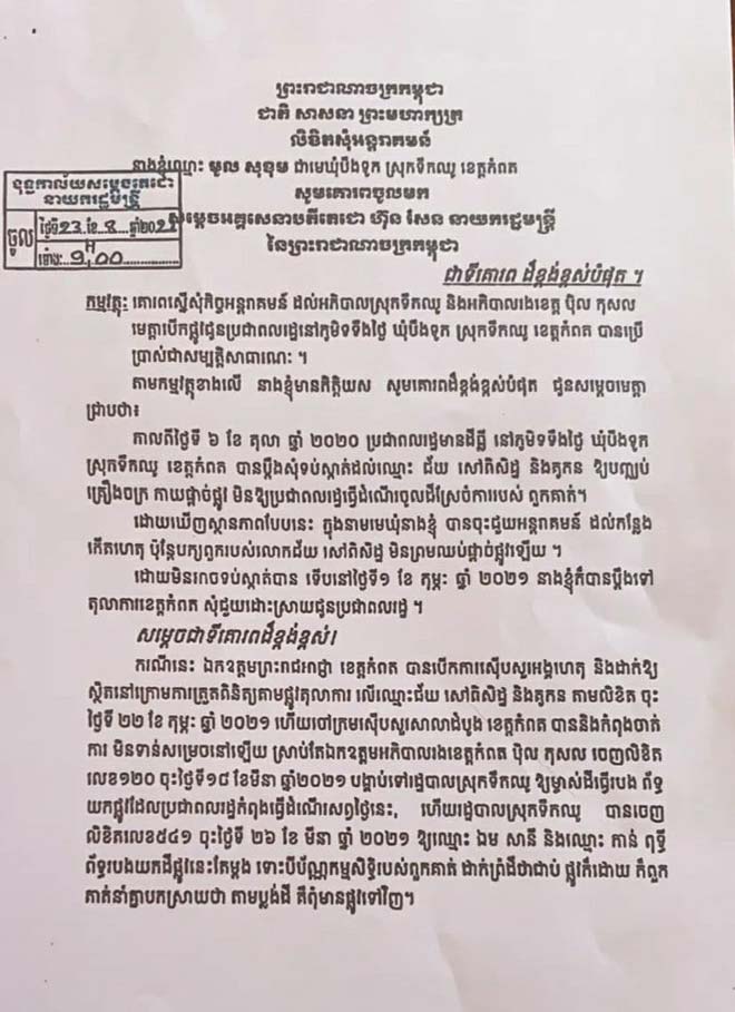 គួររំលឹកផងដែរថា បន្ទាប់ពីគ្មានដំណោះស្រាយយុត្តិធម៌ពីថ្នាក់ដឹកនាំខេត្តកំពតនាពេលកន្លងមក អ្នកមូល សុខខុំចៅសង្កាត់បឹងទូក និងប្រជាពលរដ្ឋជាច្រើននាក់ ព្រមទាំងភាគីសប្បុរសជនធ្វើផ្លូវខាងលើ បានដាក់ពាក្យប្តឹងចូលទៅកាន់ខុទ្ទការល័យសម្តេចតេជោ នាយករដ្ឋមន្ត្រី និងក្រសួងមហាផ្ទៃ ដើម្បីអន្តរាគមន៍បើកផ្លូវជូនពលរដ្ឋឡើងវិញ បន្ទាប់លោកកាន់ ពុទ្ធីនិងបាកពួក បានកាយរំលាយផ្លូវចោល ដើម្បីព្យាយាមបំបិទភស្តុតាង ហើយលិខិតអន្តរាគមន៍របស់អ្នកស្រីចៅសង្កាត់និងប្រជាពលរដ្ឋ ត្រូវបានខុទ្ទកាល័យសម្តេចតេជោ សម្រេចចារអោយសម្តេចក្រហោមស ខេងឧបនាយរដ្ឋមន្ត្រី និងជារដ្ឋមន្ត្រីក្រសួងមងាផ្ទៃចេញសេចក្តីសម្រឹច បើកផ្លូវជូនប្រជាពលរដ្ឋនៅភូមិទទឹងថ្ងៃ សង្កាត់បឹកទូក ក្រុកបូកគោ ខេត្តកំពត បានប្រើប្រាស់ជាសម្បត្តិសាធារណៈ ៕