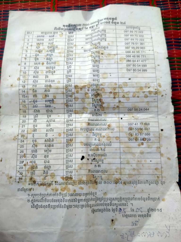 អ្នកស្រីបានបញ្ជាក់ប្រាប់អង្គភាពសារព័ត៌មាន ម្លប់សន្តិភាព យើងទាំងទឹកមុខក្រៀមក្រំថា កាលពីខែកុម្ភៈ ឆ្នាំ២០១៥ អ្នកស្រីបានលេងតុងទីនក្នុងមួយក្បាលសាមសិបម៉ឺនរៀល (៣០០០០០៛) គឺក្នុងមួយខែបង់ប្រាក់ម្តង និងមានមនុស្សចូលរួមលេងចំនួន៣១នាក់ ។ ដោយលោកវរសេនីយ៍ត្រី សោម សាវី ធ្វើជាមេតុងទីននេះ។